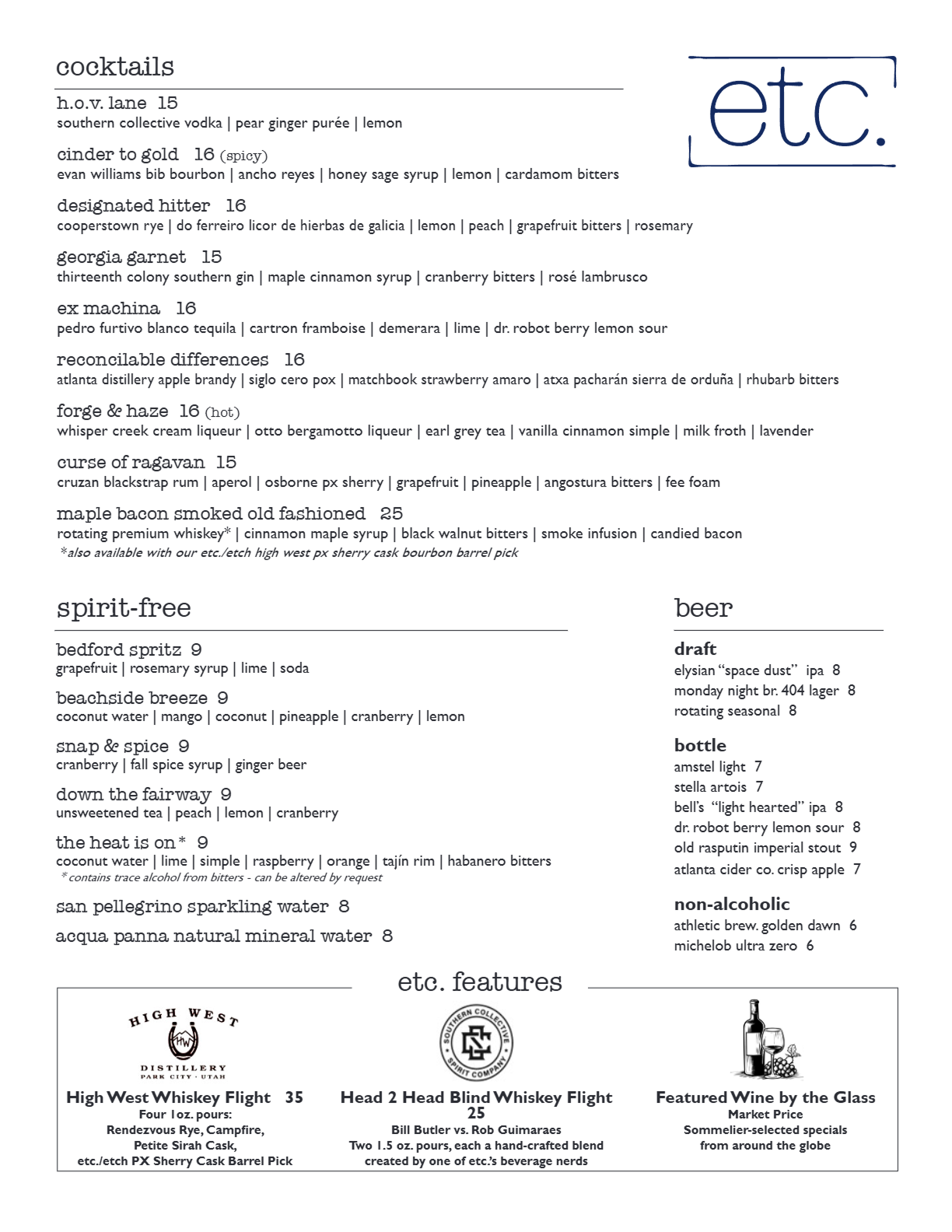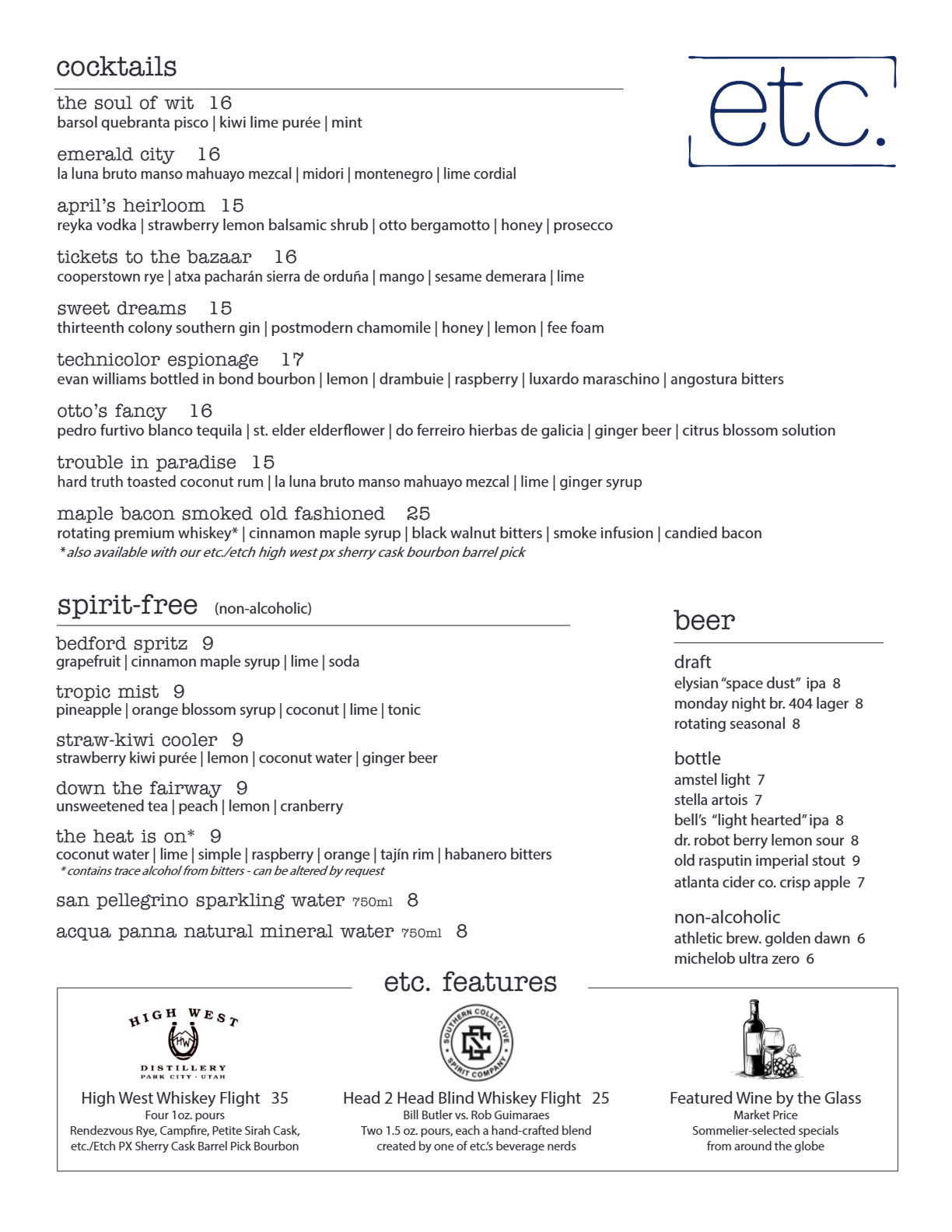 At etc., (pronounced ‘et cetera’), award-winning chef Deb Paquette brings her adventurous globally influenced cuisine to the warm neighborhood setting of Green Hills in Nashville. Considered the sister restaurant of etch in downtown Nashville, etc.’s intimate venue offers 70 seats, a cocktail bar for a dozen drinkers and diners, plus an outdoor patio.