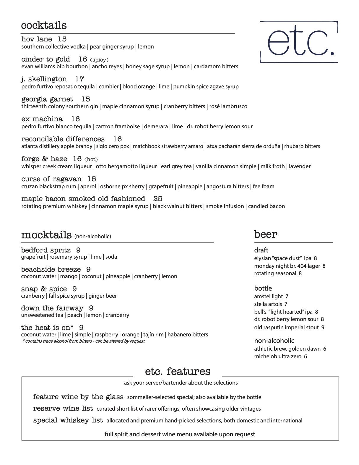 At etc., (pronounced ‘et cetera’), award-winning chef Deb Paquette brings her adventurous globally influenced cuisine to the warm neighborhood setting of Green Hills in Nashville. Considered the sister restaurant of etch in downtown Nashville, etc.’s intimate venue offers 70 seats, a cocktail bar for a dozen drinkers and diners, plus an outdoor patio.